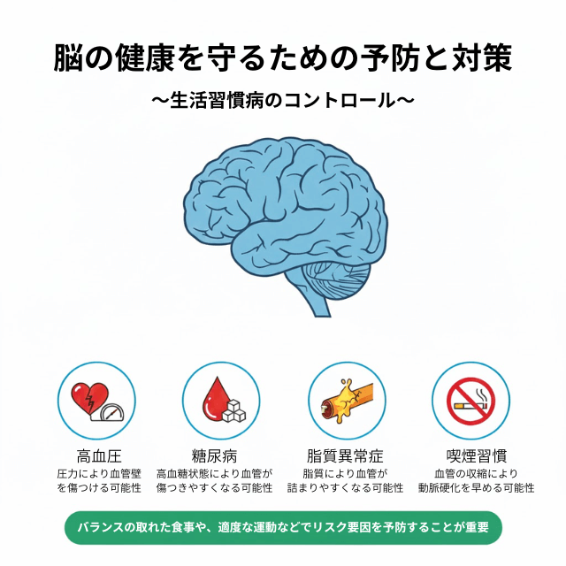 重要なのは原因となる病気を予防することです。ここからは、高次脳機能障害のきっかけとなる脳卒中(脳梗塞や脳出血)の対策について見ていきましょう。