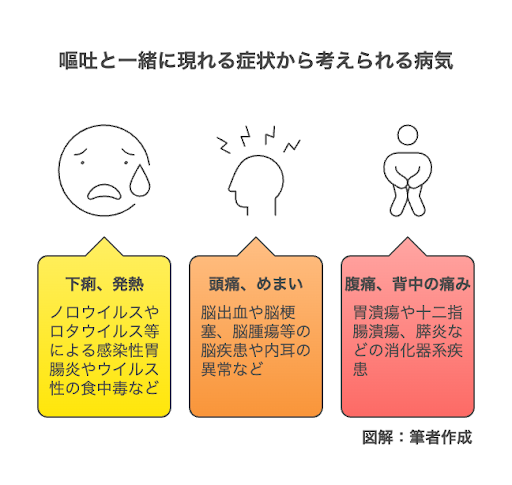 嘔吐が起こった際、原因を考えるためには、その他の症状を確認することが大切です。ここからは以下の症状から考えられる病気について解説します。