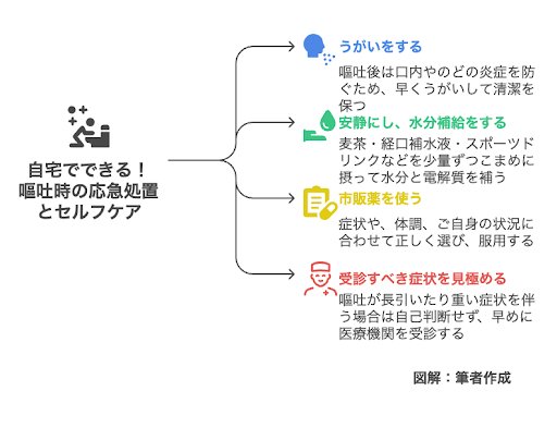 嘔吐した時、すぐに医療機関を受診できない場合もあるでしょう。そのような場合は、応急処置やセルフケアが重要です。ここからは「嘔吐時にどのような対応が適切か」を解説します。