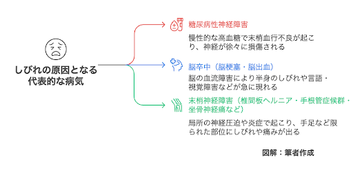 しびれを起こす代表的な病気をおさらいしておきます。糖尿病性神経障害、脳卒中(脳梗塞・脳出血)、椎間板ヘルニア、手根管症候群、坐骨神経痛などは頻度が高いため覚えておくとよいでしょう