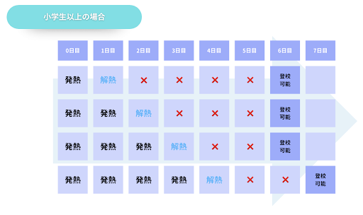 小学生以上の場合、発熱日を0日として5日を経過し、かつ解熱後3日目からの登校が可能となります。つまり、発熱した日から数えると、6日間の出席停止が必要となります。その後は、解熱した日によって出席停止日が延期されていきます。