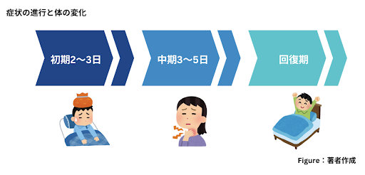 回復期 体調は回復するが、倦怠感や咳は1週間程度続くことも 熱はほぼ平熱になり、日常生活が可能になる。ただし、疲れやすさや軽い咳が残ることもあり、無理に活動すると再び体調を崩すこともある。