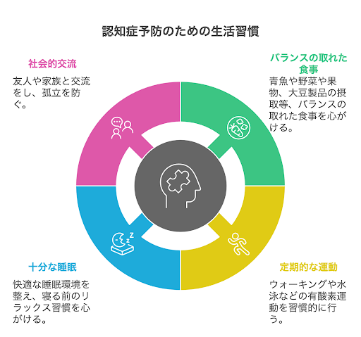 認知症予防には、バランスの良い食事や運動、睡眠、社会参加などが重要です。それぞれ、詳しく見ていきましょう。