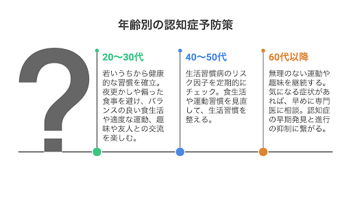 認知症予防のためには、年齢に合わせて生活習慣や意識を変えることが大切です。