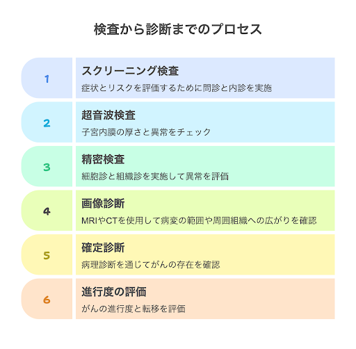 スクリーニング検査では、まず問診や内診を行い、症状の有無や子宮体がんリスクを評価します。次に、エコー検査によって子宮内膜の厚みや形、異常な病変の有無をチェックします。経腟エコーは特に内膜の詳細な確認に適しており、不正性器出血などの初期症状がある方に推奨されます。ここで疑いがあれば、追加の精密検査に進む流れとなります。