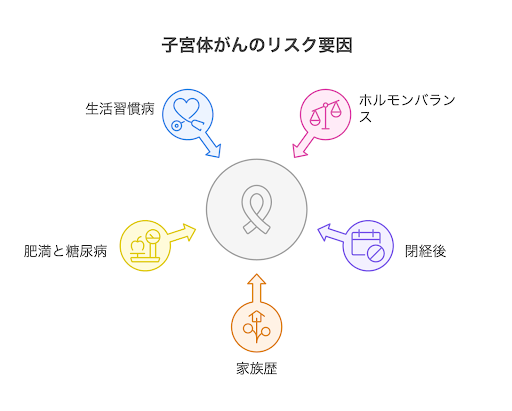 特に家族に婦人科がんの患者がいる方や、子宮内膜増殖症や多嚢胞性卵巣症候群(PCOS)の既往がある方も発症リスクが増加する傾向が高いです。また、肥満、糖尿病の方は、血中にインスリンの量が多くなる高インスリン血症という状態になっており、これがエストロゲンの分泌を促進するため、子宮体がんになりやすいと考えられています。