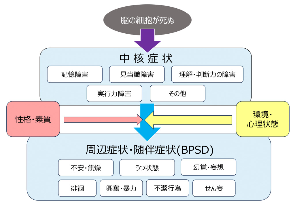 中核症状は、加齢変化や病気による脳の変化(神経細胞の変性・脱落など)によって起こる症状とされています。