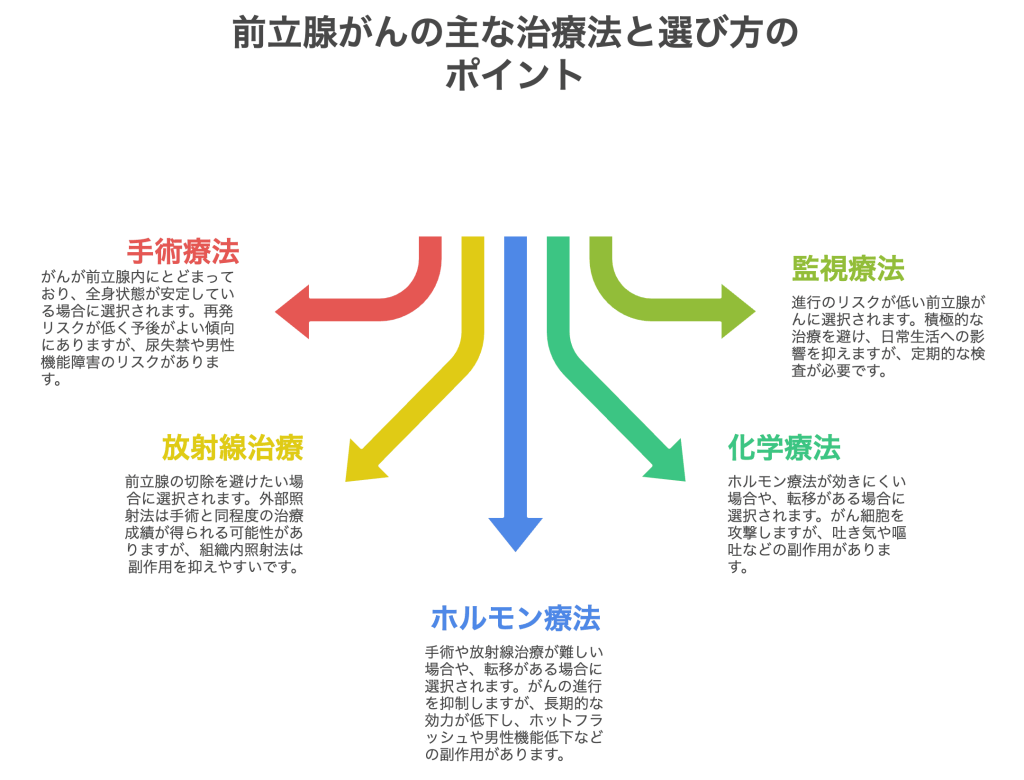 前立腺がんの治療では、主に以下のような治療法が選択されます。